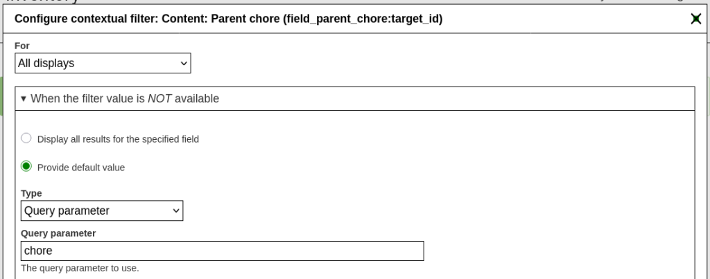 Then created an entity reference view display, using the "chore" url query parameter as the contextual filter for parent chore. That query parameter was added to the Views Add Button for Entity Prepopopulate to fill in the Chore reference field.